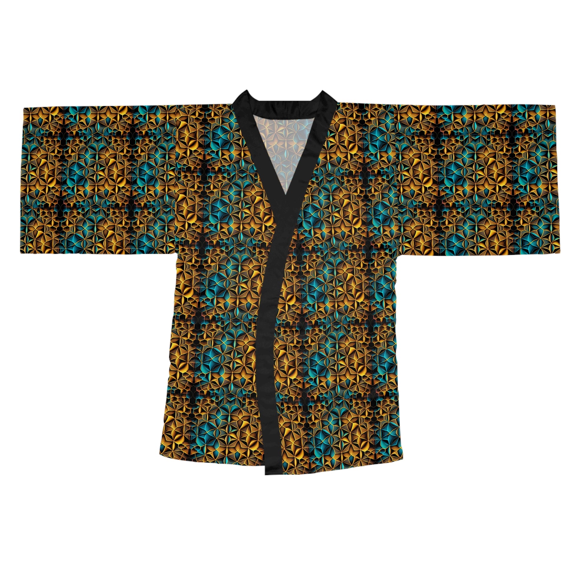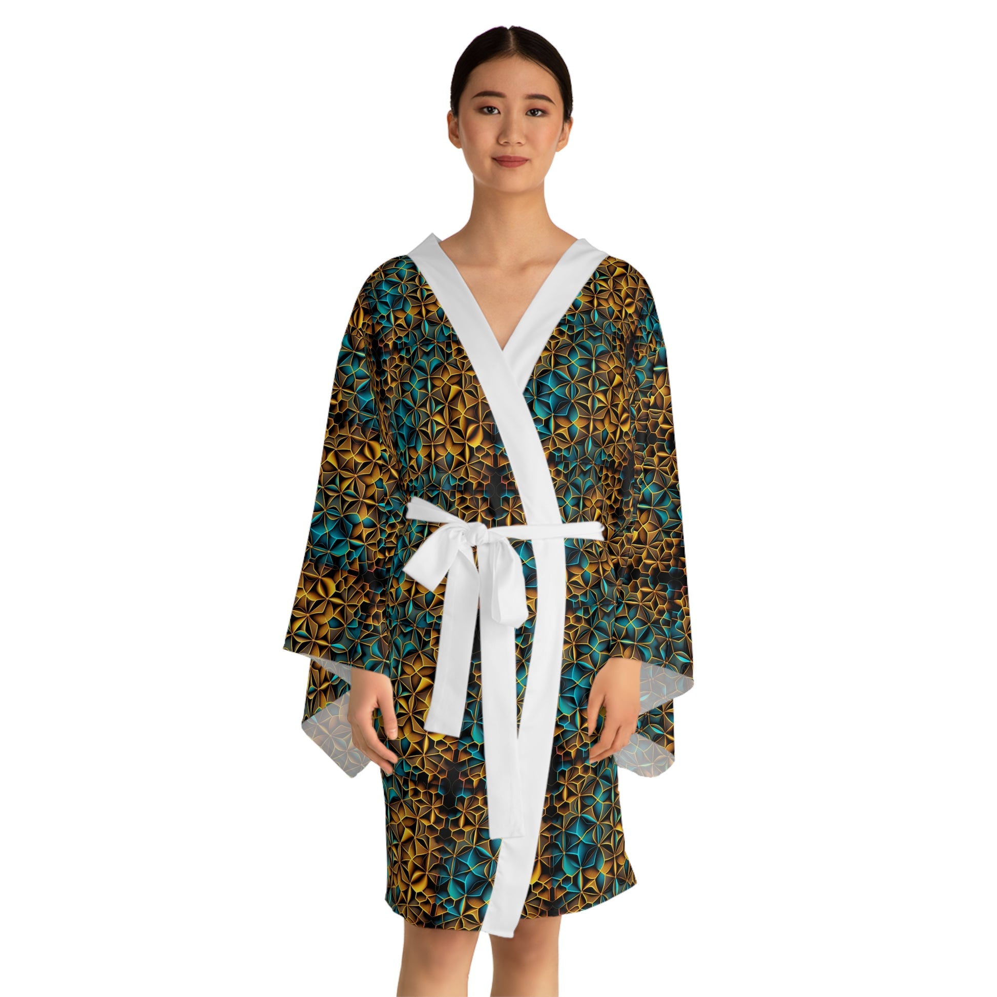 Mid-Length Long-Sleeve Unisex Kimono Style Sacred Geometry Festival Robe Cover-Up with Belt